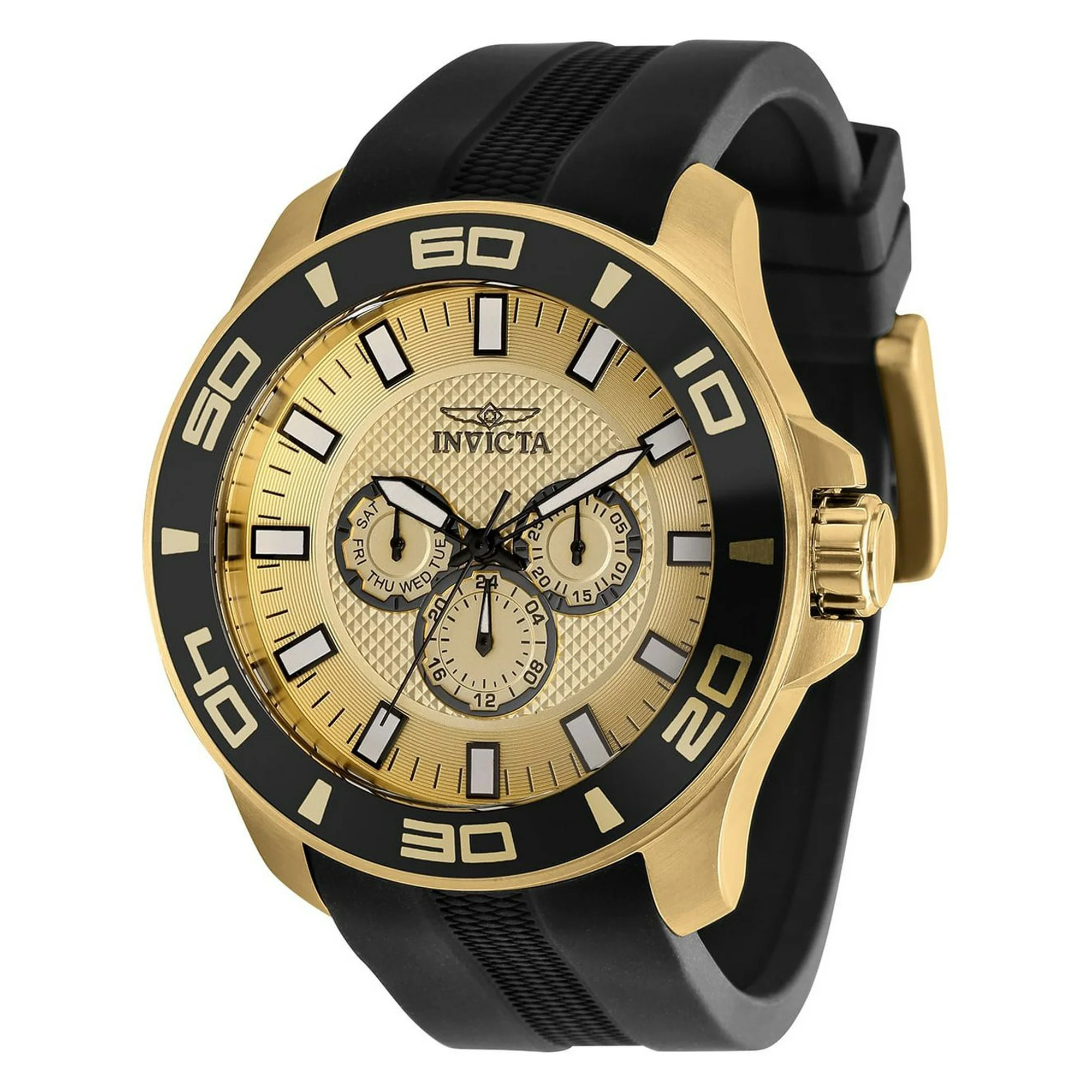 Elevate your style with the Invicta Pro Diver Men’s Stainless Steel Gold Dial Chronograph Quartz Watch. This watch is designed for those who appreciate sophistication and high performance, seamlessly blending form and function.